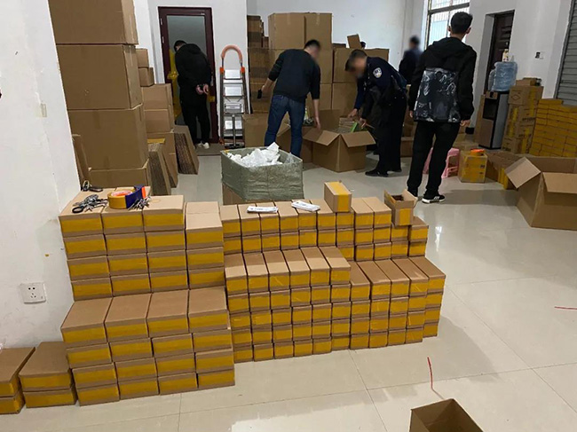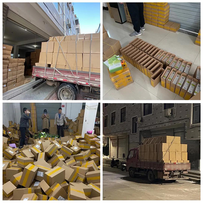 11月9日,在接到四季優美打假維權部門報警后,安徽省合肥市公安局蜀山區分局一舉查封了位于浙江省東陽市東義路某小區的假冒“隨便果”倉庫,現場查獲尚未來得及發出的假貨8150盒,并對全部假冒產品予以扣押。與此同時,另一路公安干警奔赴湖南省婁底市雙峰縣,迅速抓獲了藏匿于某小區的售假網店運營人員,依法查封20余家售假網店,并計劃進一步追查假貨源頭,絕不讓任何一個涉案者漏網。