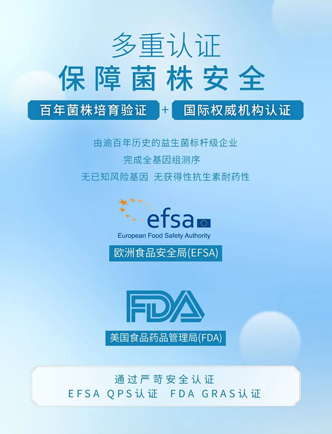 同時,養顧問所選菌株均已完成全基因組測序,無已知的風險基因,無獲得性抗生素耐藥性,且全部通過美國FDA GRAS認證,菌種已通過歐洲EFSA QPS認證;養顧問所含5個菌株均在國家衛健委發布的《可用于食品的菌種名單》,其中2株收錄于國家衛健委發布的《可用于嬰幼兒食品的菌種名單》。