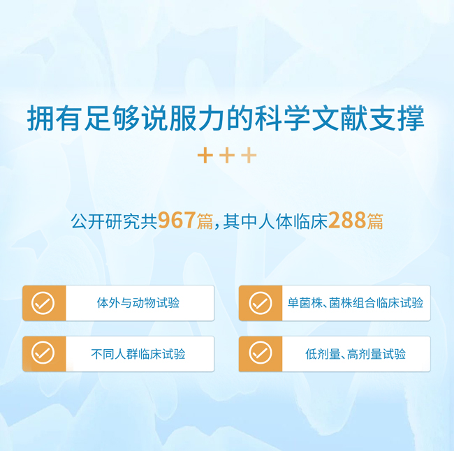 養顧問所選用菌株的另一優勢在于,全部成功通過細胞水平的菌株培養與篩選、胃腸道模擬試驗、體外與動物試驗、人體臨床試驗這四關,可以確保每個菌株在有效性方面具備充分的數據支撐。截至2021年1月,圍繞該五個菌株的研究文獻已公開發表701篇,其中,人體臨床研究多達191篇。